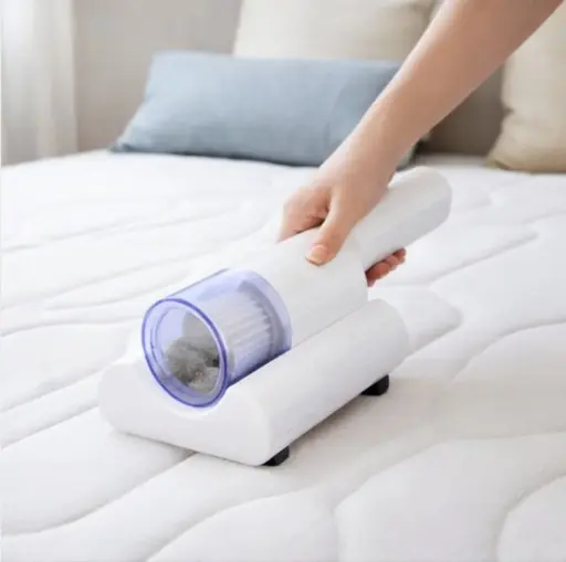 Aspiradora portátil para limpieza de colchones y tapizados, diseñada para eliminar polvo, ácaros y pequeñas partículas que se acumulan en telas. Su diseño compacto permite usarla fácilmente sobre camas, sillones, almohadas, alfombras y asientos de auto.
